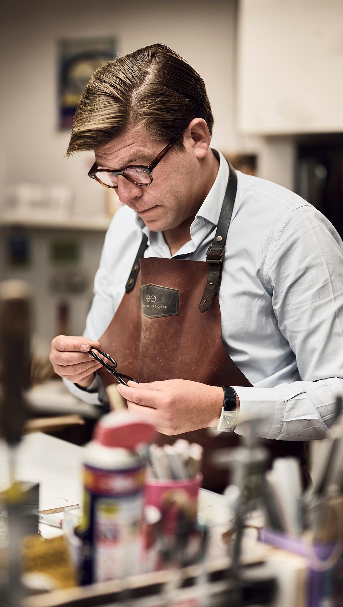 Ludovic Elens: Mijn leermeesters waren prototypisten, ze maakten monturen per stuk en hebben hun knowhow aan mij doorgegeven. Ik heb eerst voor een merk gewerkt dat kwantiteit vooropstelde, tot ik de voorkeur aan kwaliteit ging geven. Een klant kon geen montuur vinden dat aan zijn behoeften voldeed, dus besloot ik er zelf een te maken.