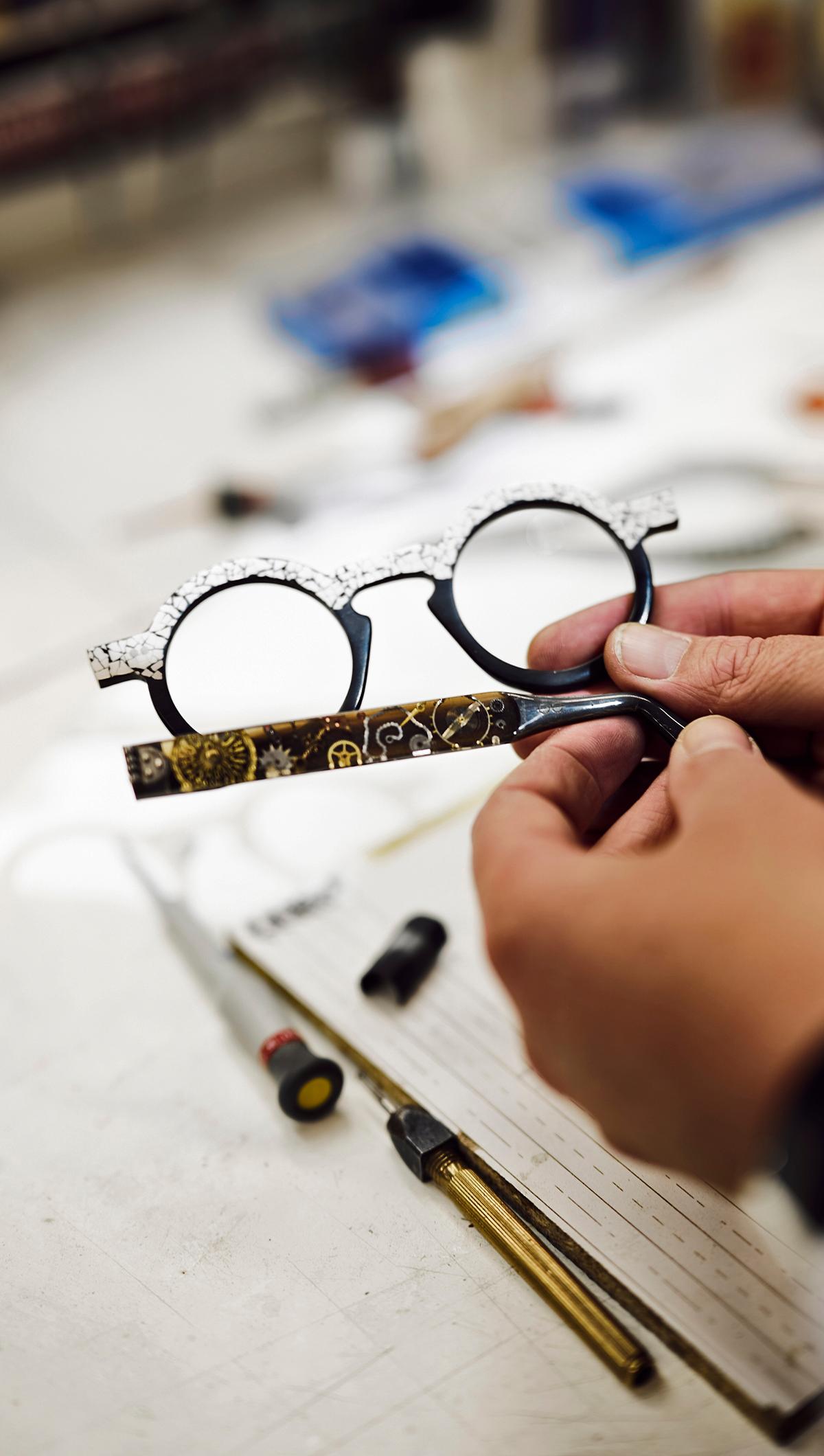 We beginnen altijd met een blanco blad. We gaan in gesprek met de klant om zijn stijl en wensen te begrijpen. Moet hij op zijn imago letten? Kunnen we alle materialen gebruiken? Is hij excentriek of eerder gereserveerd? Vervolgens ontwerp ik prototypes in karton, opdat we nog aanpassingen kunnen doorvoeren. Dan volgt de keuze van het materiaal - celluloseacetaat, metaal, goud, buffelhoorn of hout - met of zonder versieringen uit hout of met edelstenen. Tenslotte wordt de bril tijdens de ‘fitting’ verder verfijnd, met name wat de pootjes en de glazen betreft. Het hele proces duurt ongeveer drie maanden.